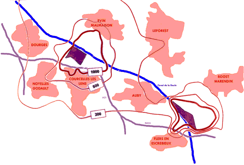 Les communes concernées sont Noyelles-Godault, Courcelles les Lens, Evin-Malmaison, Leforest, Dourges, Auby (à Auby, existe une autre usine traitant du Plomb et du Zinc : la CRAM (Compagnie Royale Asturienne des Mines) devenue l'Union Minière, puis Umicore. La pollution a été prise en compte dans les courbes d'isopollution de l'INRA.