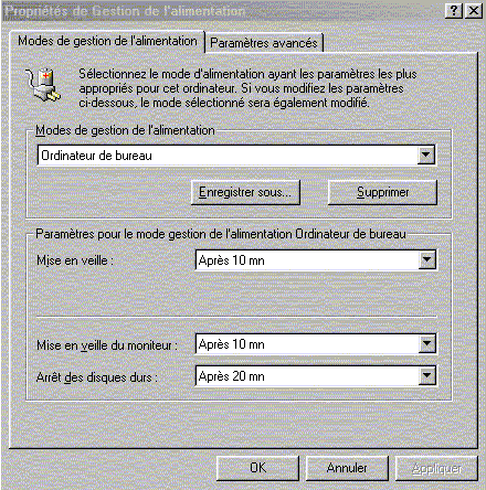 La première mesure rapporte gros, et elle est gratuite. Sur toutes les machines vendues depuis 4 ou 5 ans se trouve un gestionnaire d'énergie. C'est généralement Energy Star. Mais il n'est jamais activé, sauf sur certains écrans. Il faut aller l'activer dans le panneau de configuration « Options d'alimentation » On paramètreta l'arrêt d’écran après 10 minutes d'inutilisation (le mien est même calé à 5 minutes). et l'arrêt total de l'unité centrale après vingt minutes d'inutilisation Cette simple mesure provoque une réduction de consommation de l'écran qui est en moyenne de 60%. et celle de l'unité centrale de 51%. Voilà pour ce qui est gratuit.
