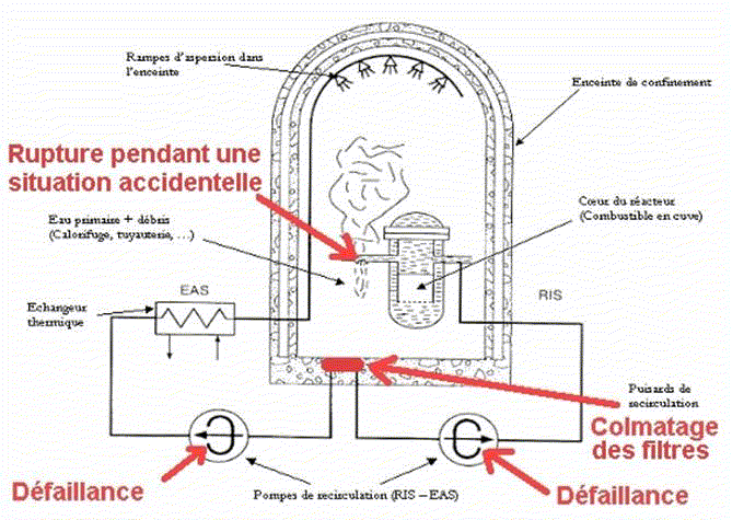 Le schéma ci-dessous, tiré du site web de l'ASN et complété par nos soins, montre bien les DEUX défaillances possibles des circuits de recirculation